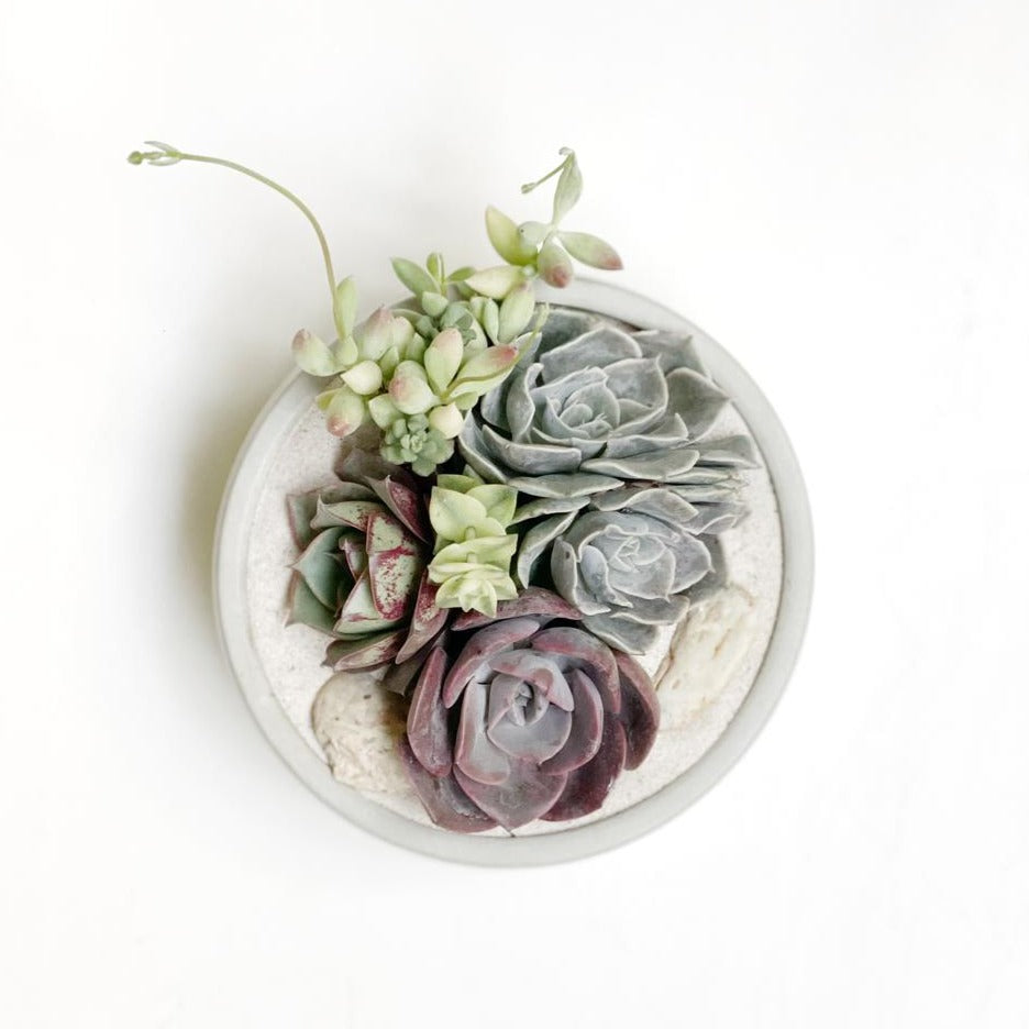 Arreglo compuesto de suculentas variadas en maceta. La maceta viene con agujero de drenaje y protegida con varias capas de impermeabilizante para mayor protección y durabilidad contra el agua.