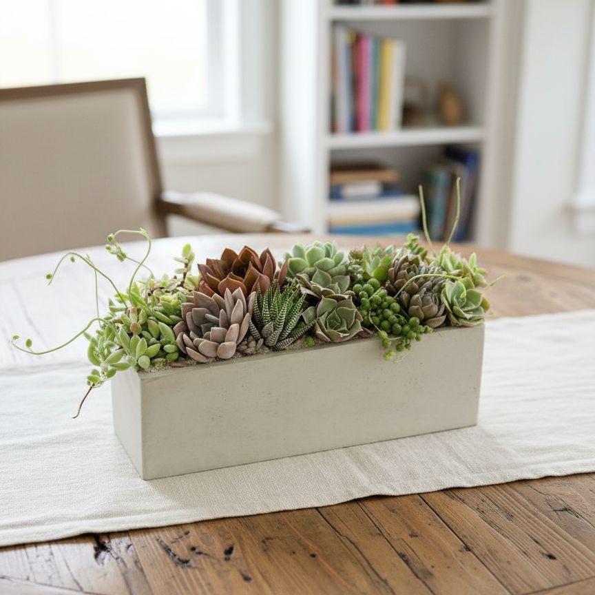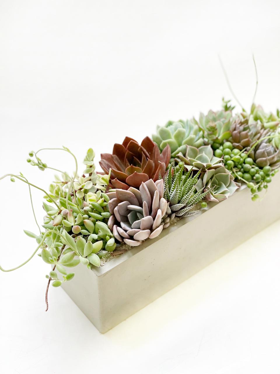 Arreglo compuesto de suculentas variadas en maceta. La maceta viene con agujero de drenaje y protegida con varias capas de impermeabilizante para mayor protección y durabilidad contra el agua.
