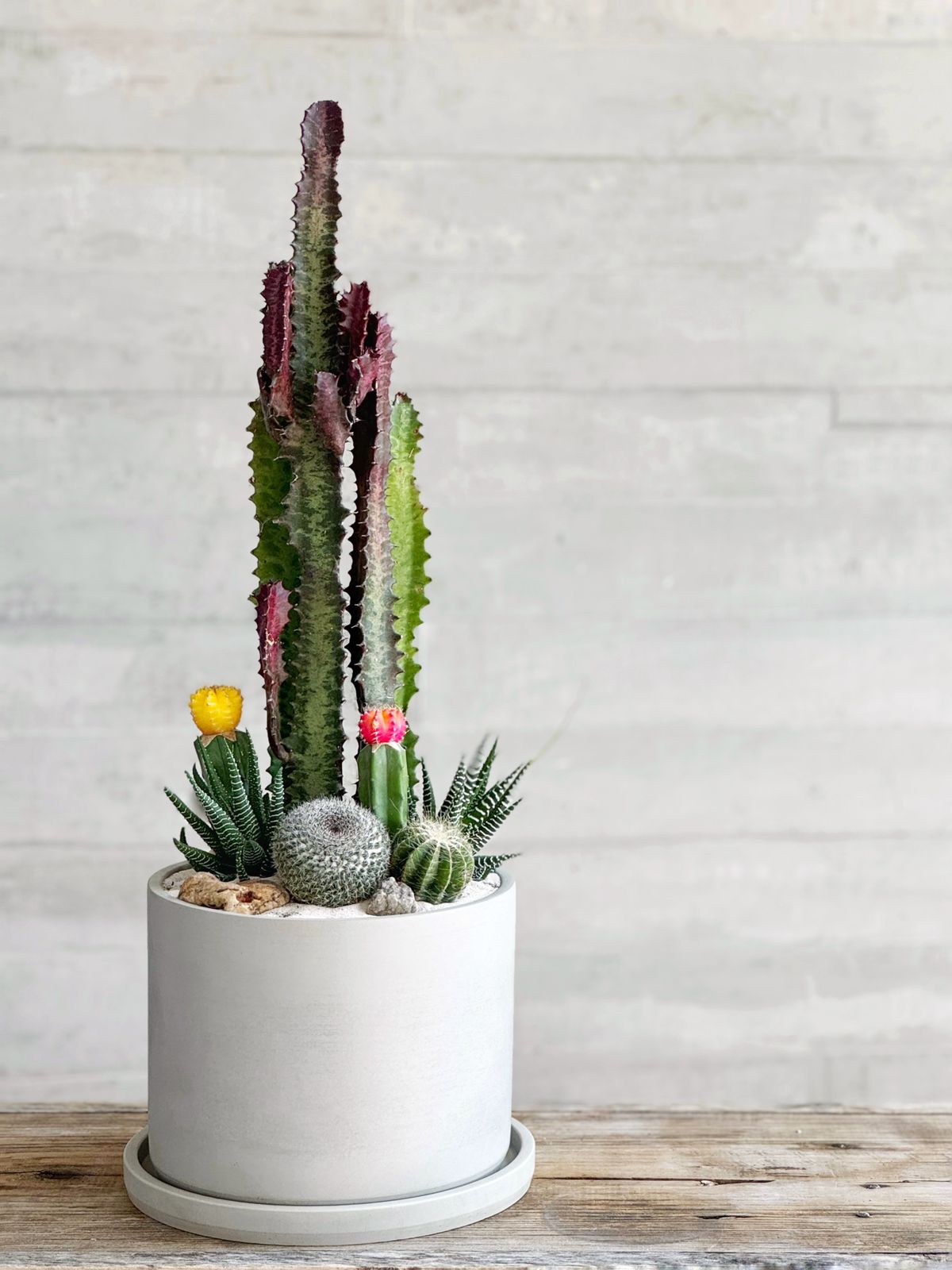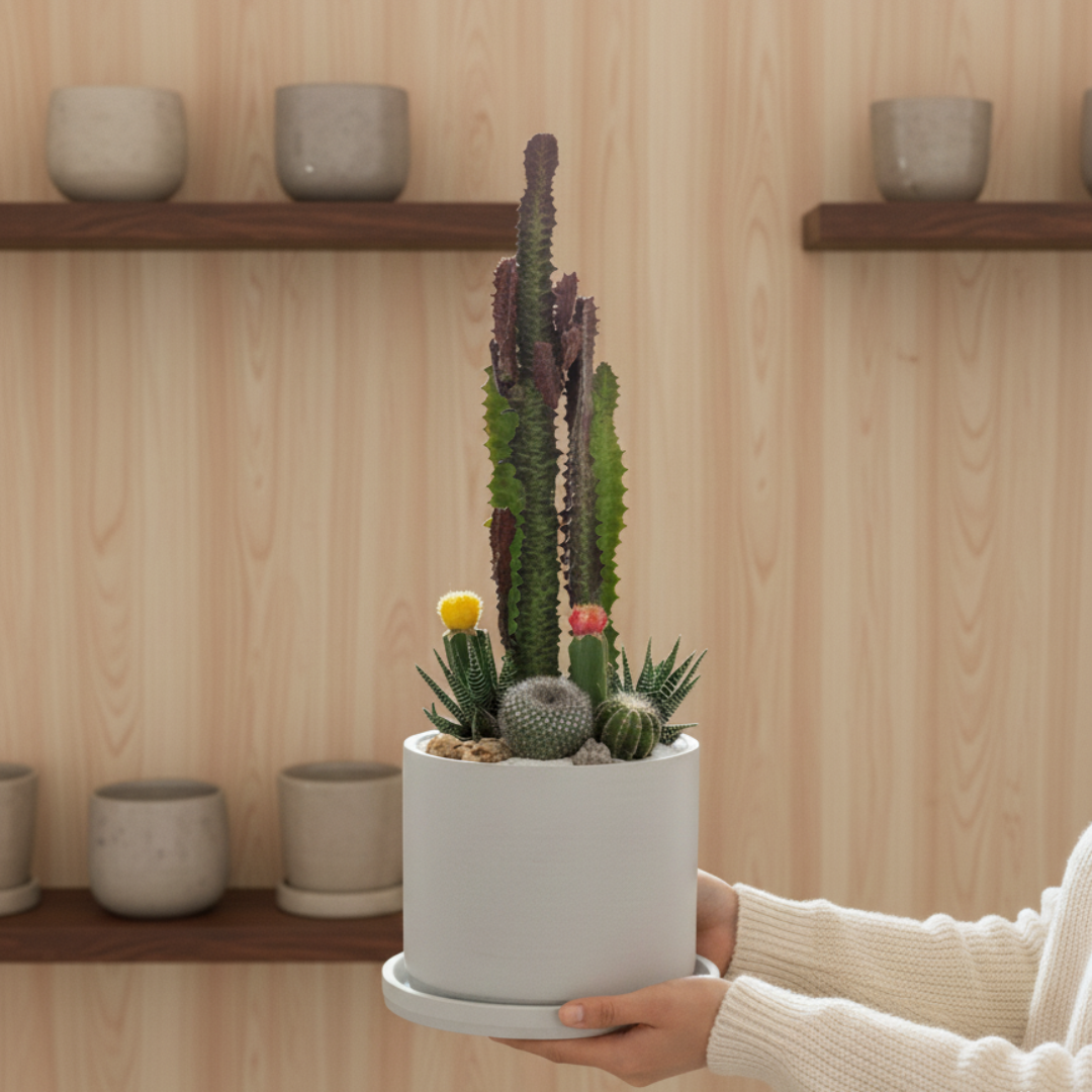 Jardín desértico en cilindro que captura la belleza minimalista de la flora árida. Esta composición presenta una selección curada de cactáceas y suculentas desérticas, cuidadosamente dispuestas en un contenedor cilíndrico de diseño contemporáneo. Cada especie ha sido elegida por su resistencia y características visuales distintivas, creando un ecosistema de bajo mantenimiento que prospera con luz indirecta y riego ocasional. Ideal para espacios modernos que demandan un toque natural sin comprometer la estética. Una pieza viva que requiere mínima intervención y máximo impacto decorativo.