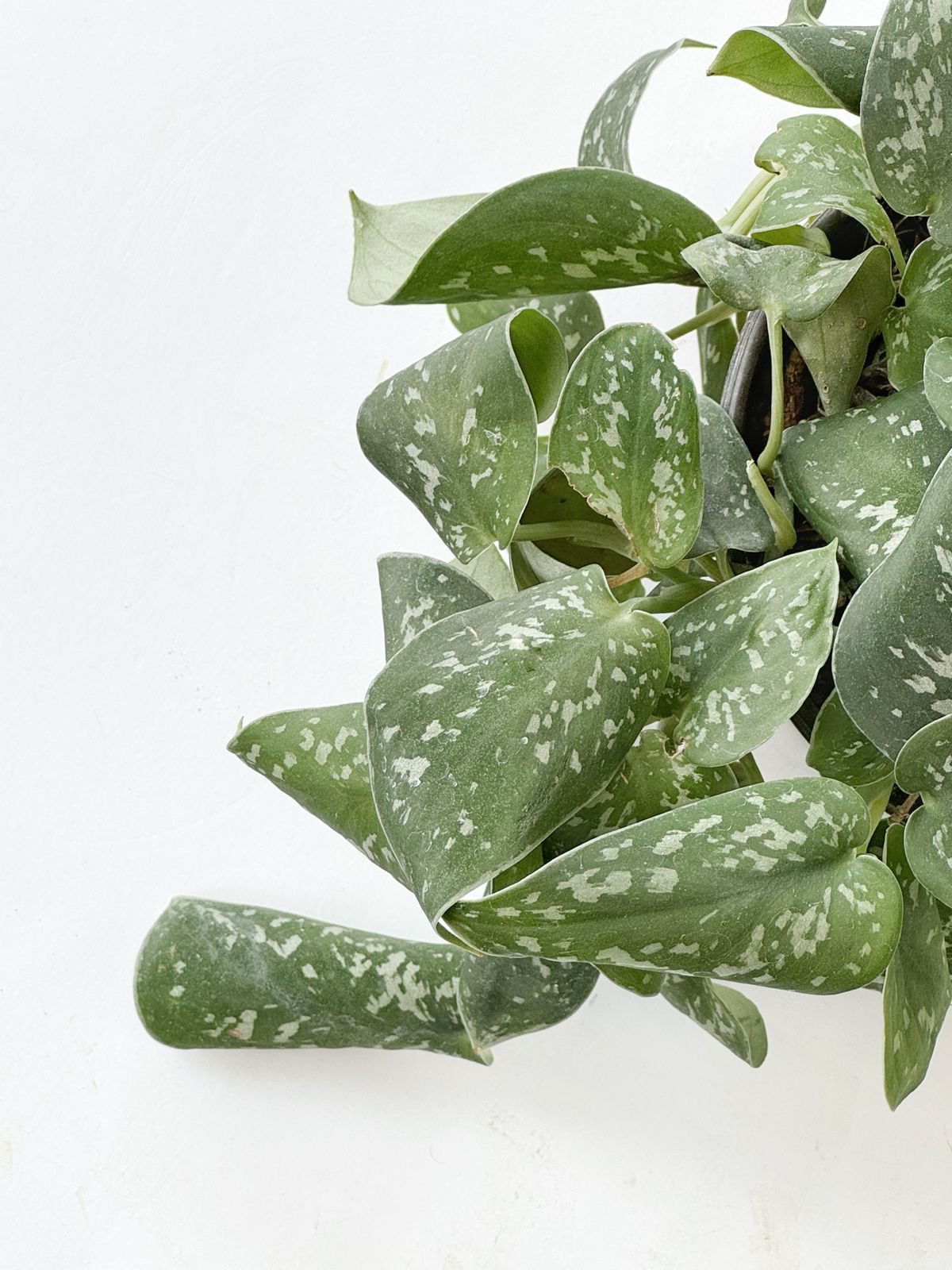 Es originaria del sudeste asiático y es conocida por su llamativo follaje. Las hojas son en forma de corazón y tienen una textura aterciopelada con marcas plateadas, lo que les da un aspecto satinado. Scindapsus pictus es una opción popular de planta de interior debido a su atractivo follaje y sus requisitos de cuidado sencillos. Prospera en luz brillante e indirecta y prefiere un suelo bien drenado. Riega moderadamente, permitiendo que la pulgada superior de la tierra se seque entre riegos. Esta planta también se beneficia de una pulverización ocasional para aumentar la humedad.