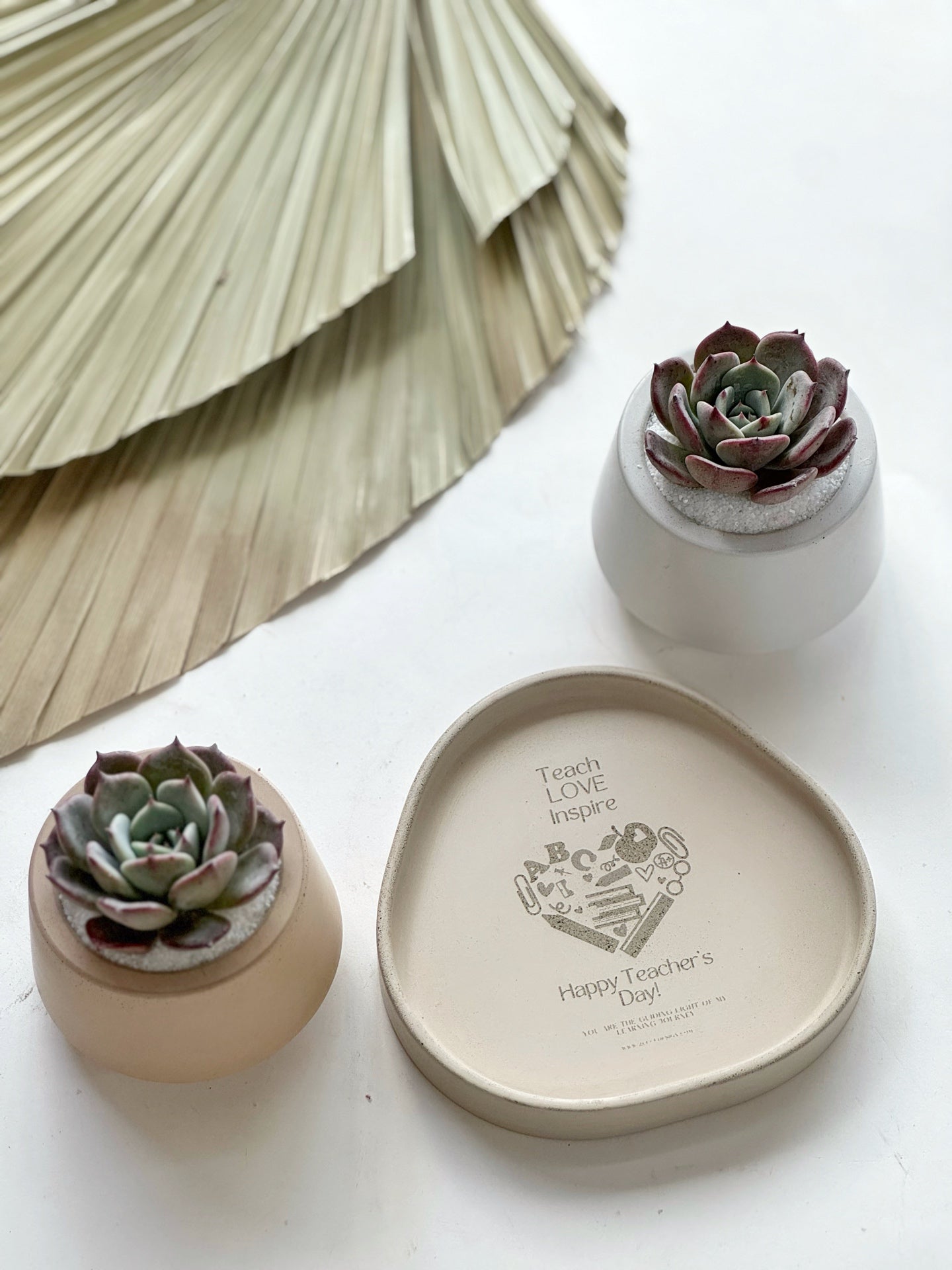 Puedes elegir una vela o una planta para que vaya con tu set. También puedes personalizar los colores tanto de la vela como de la maceta y el mensaje. Si eliges planta, el mensaje viene en la charola. Si eliges vela, puedes optar por también añadirle las iniciales a la tapa de la vela o alguna frase especial.